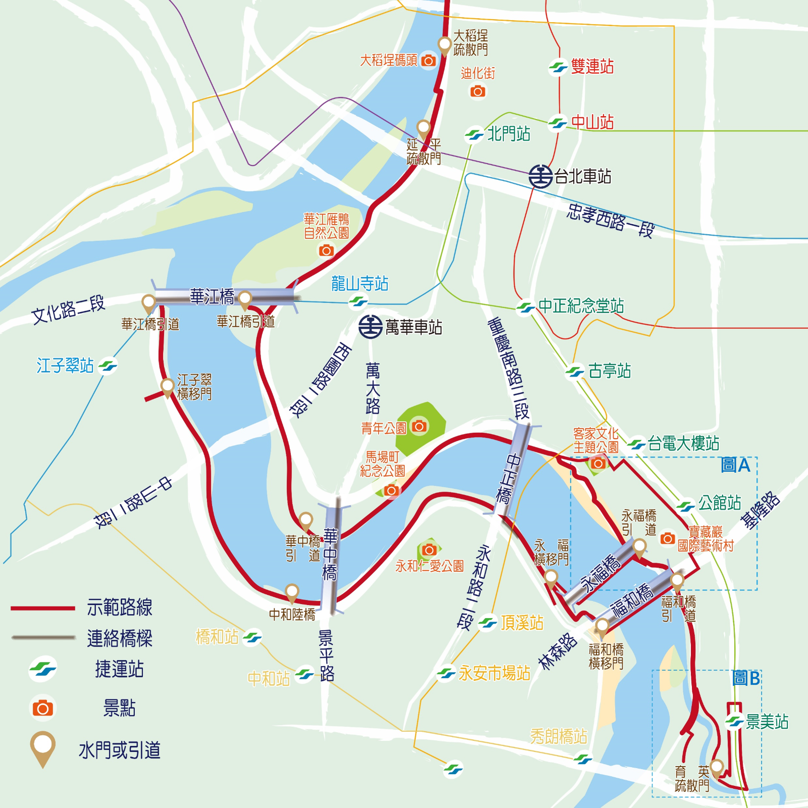 本計畫構想係利用雙北河濱自行車道做為通勤的主幹,騎士可利用跨越橋梁進入另一端,銜接地方自行車路線或公共運輸場站,本計畫示範路線如圖1所示: