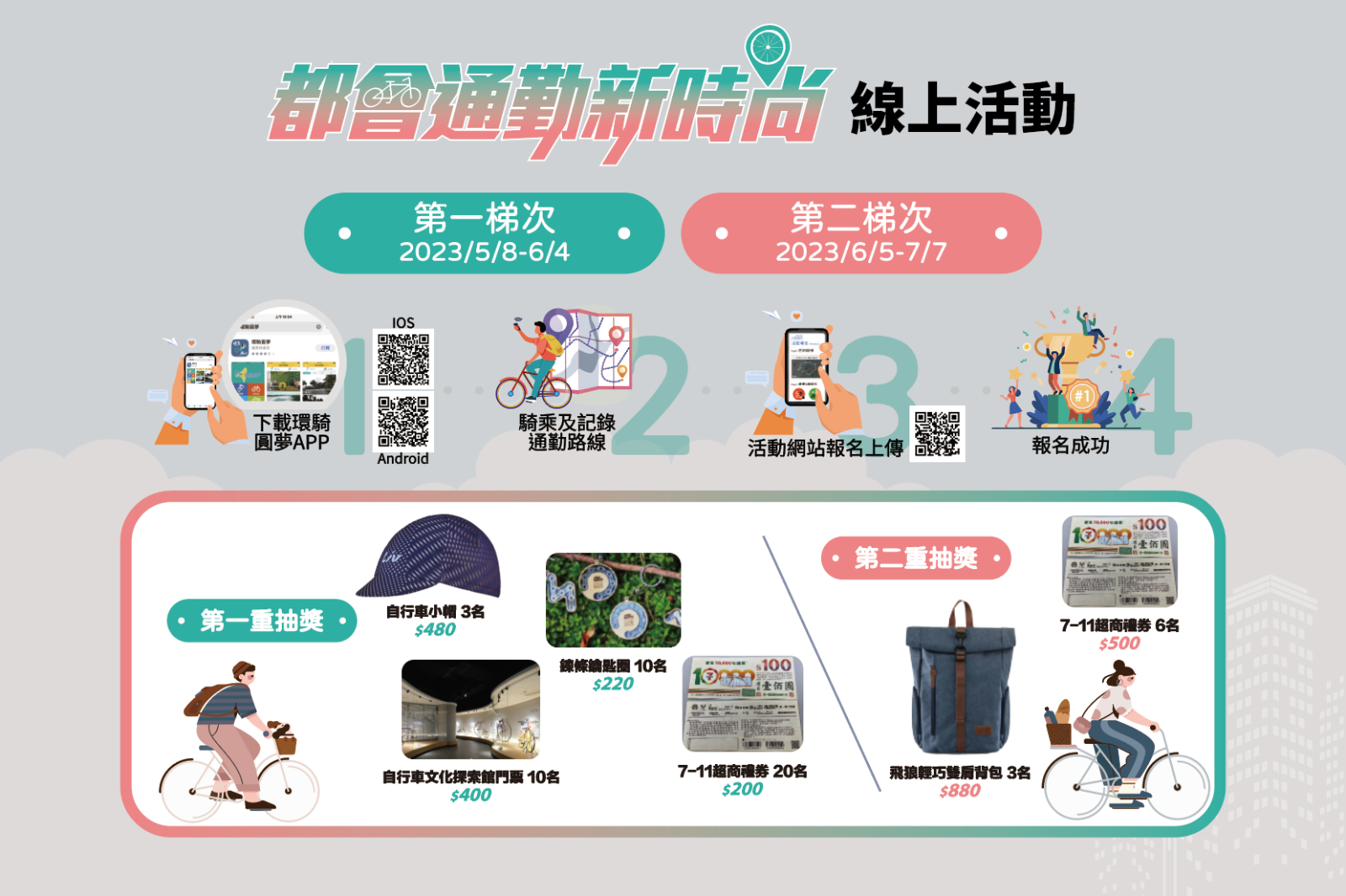 為鼓勵及養成民眾利用自行車通勤習慣,並實際體驗本次示範計畫規劃成果,爰於5月8日(星期一)~7月7日(星期五)為期兩個月的時間,辦理線上集章活動,本次活動共分成兩梯次,第一梯次為5/8~6/4;第二梯次為6/5-7/7,活動辦法如下: